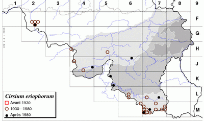 N.B. : le cirse laineux est très abondant en France, immédiatement au sud de la Gaume en L6, M6 et M7, de même qu'au sud de Couvin, dans la dépression liasique et sur la côte du Bajocien-Bathonien.