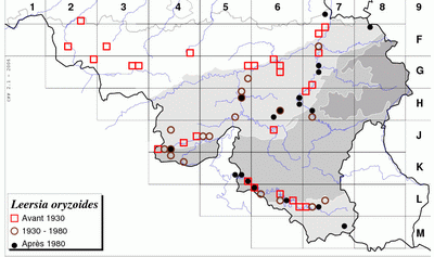 D’après LAWALREE et DELVOSALLE (1969), l'espèce était autrefois assez rare à rare dans les districts brabançon et mosan et très rare dans le district ardennais (Semois). Elle était en régression partout suite aux assèchements et à la pollution. Actuellement, Leersia oryzoides se maintient relativement bien dans les vallées de l'Ourthe et de la Semois. Ailleurs, elle a régressé, mais elle est peut-être sous-détectée, car elle peut être confondue à l'état stérile avec la baldingère.