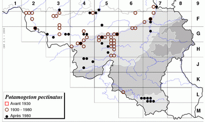 Potamogeton pectinatus, comme les autres hydrophytes, a quasi disparu de la vallée de la Meuse belge. Par contre, cette espèce est plus abondante dans la vallée de la Semois que ne l'indique l'Atlas. Elle a été trouvée en plusieurs nouvelles stations de la vallée de la Haine (ANRYS et al., 1991). Espèce peut-être méconnue.