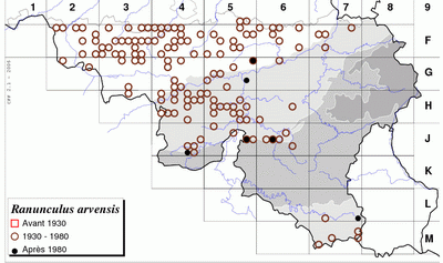 D'après LAWALREE et DELVOSALLE (1969), l'espèce naguère encore assez largement répandue était en forte régression à cause de la modification des pratiques culturales (triage des graines, utilisation d'herbicides). Espèce en voie de disparition mentionnée de 6 stations seulement après 1980.