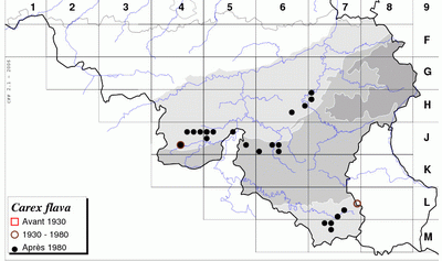 Le statut actuel de la laîche jaunâtre est difficile à fixer par rapport au passé, étant donné que seule une carte de Carex flava s.l. a été reprise dans l’Atlas de 1979. La carte ci-contre ne reprend que les données de C. flava s.str. et est donc incomplète pour la période <1980. Etant donné son écologie, l'espèce est vraisemblablement en forte régression.