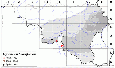 District ardennais (Ardenne occidentale). Hypericum linariifolium a été trouvé pour la première fois en Belgique, en 1986 (CLESSE et DUVIGNEAUD, 1987). N.B. : l'espèce a été observée en France en K5. Ces stations du district ardennais constituent un îlot isolé de l'aire continue de l'espèce.