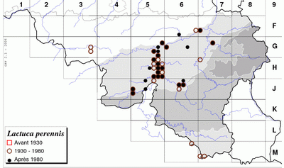 D'après LAWALREE et DELVOSALLE (1969), l'espèce, qui était autrefois rare dans le district mosan et très rare dans les districts brabançon et lorrain, était en régression locale dans le district brabançon en raison de l'extension des carrières. Actuellement l'espèce a disparu de ses stations des districts brabançon et lorrain. Les populations de laitue vivace semblent assez stables dans la vallée de la Meuse et dans les sites protégés du Viroin et de Lesse et Lomme. Certaines restent menacées par la réouverture de carrières (la Belle-Roche à Sprimont, par exemple).